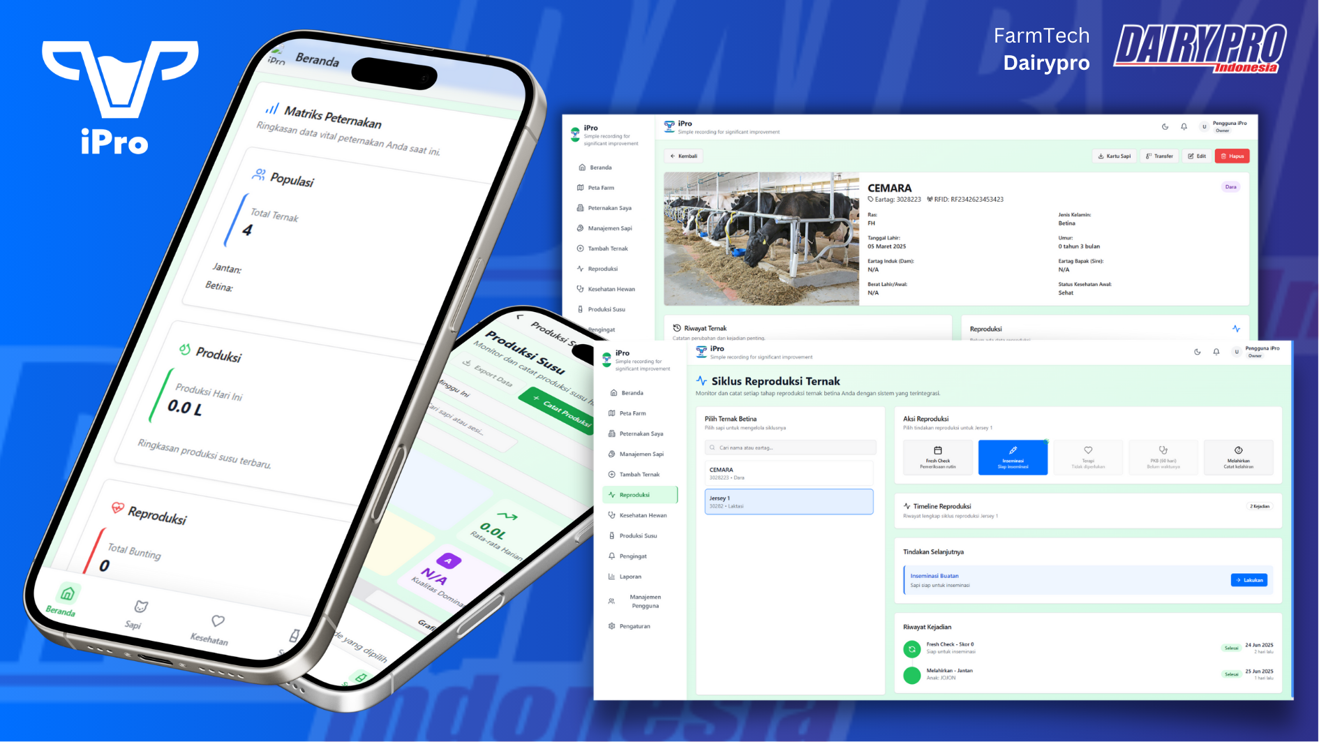 Didalam iPro peternak mampu mengetahui kondisi peternakan saat ini sesuai dengan data record peternakan, mempermudah peternak mengetehaui populasi dan detail sapi terkini mulai dari data Kesehatan produksi bahkan reproduksi yang akan membuat peternakan menjadi lebih efisien.